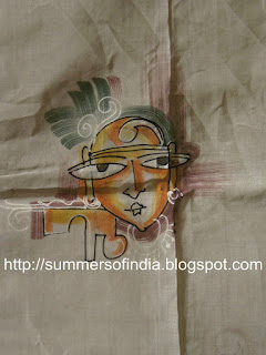 This sari was painted using fabric paints. I have used a fine cotton sari . I was apprehensive of using costly silks. Though I am passionate about painting, especially on fabrics and used to experiment a lot, my painting skills are very limited and I have picked up my brush again after a very long time. The design - I have shamelessly copied from one on my friends sari which she bought on a trip to Kolkotta. I could not come any where near the original one painted by the artist from Bengal. It was so beautiful that I copied the design, but I think I have failed to capture it as it was.