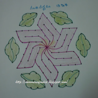 This is 13 to 7 dots. Flower in the center and surrounded by leaves. The flower resembles the white flower below it is known as rekha(single petal) Nandivardhanam.