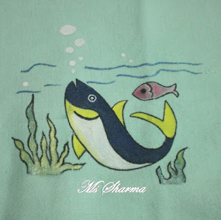 I just loved the expression of this fish-all jubilant and that's why selected to paint it. The back ground fabric was a very thick casement fabric. It is very difficult to paint and if not painted properly, the paint will peel off on washing.